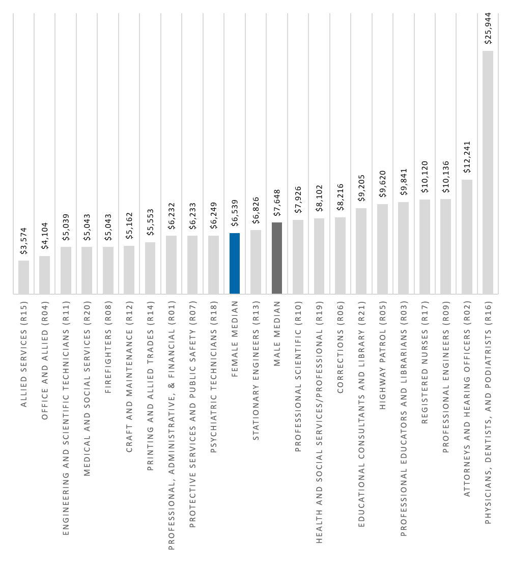 To find the median pay by gender, the base pay for all full-time civil service female and male workers is separately arranged from high to low. The median is then identified – meaning half of the salaries are above and half are below. Monthly base pay for females and males is displayed in the chart below. Female monthly base pay is represented by the blue bar on the left, and male monthly base pay is represented by the grey bar on the right. The white line represents where the median base pay is located in each bar. As of 2021, the median monthly pay for women was $6,539, and $7,648 for men.