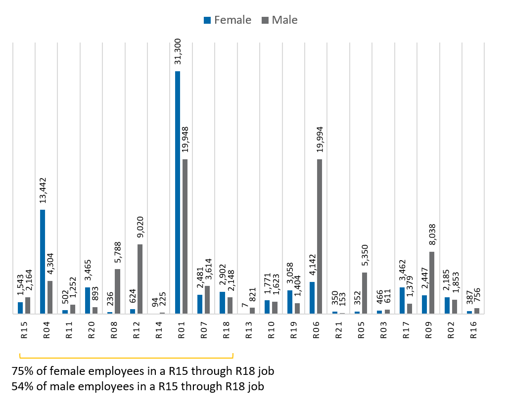 The most refined analysis comes from comparing how males and females are paid within state classifications. As shown below, fewer than one third of state classifications show a female pay gap. The classification system reduces the risk of pay gaps because state civil service employees are paid within a prescribed pay range for each classification. Most employees do not negotiate a starting salary, a practice that is much more common in the private sector. Employees typically start at the minimum salary and progress over time to the maximum salary of the range. For many state classifications that can take up to five years. Any gender pay gaps within state classifications are primarily driven by a larger share of men or women at one end of the pay range.