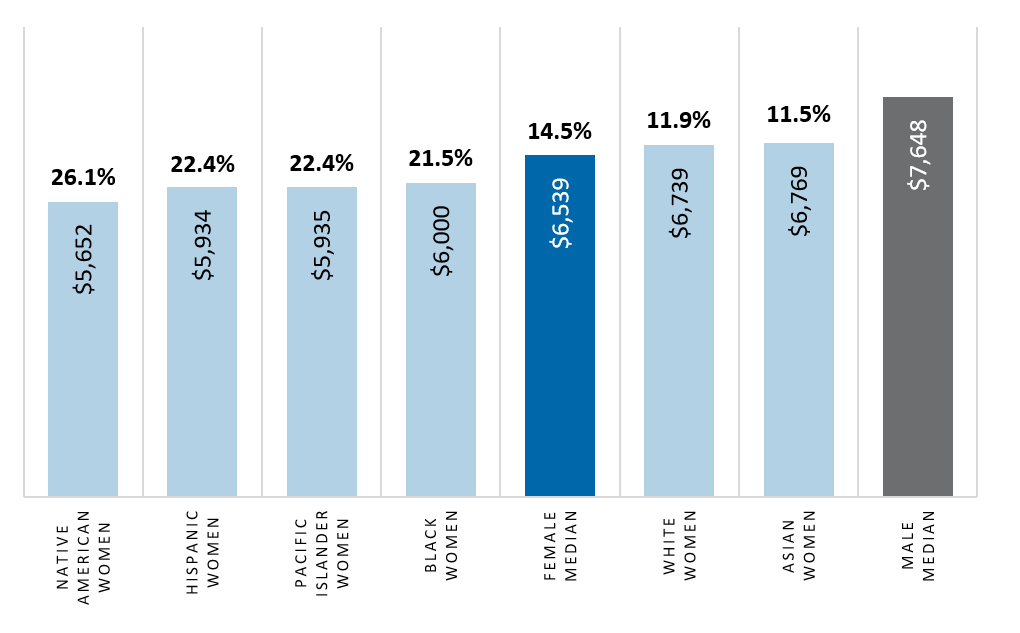 A gender pay gap can also be calculated by ethnic group. This is accomplished by comparing each group’s median pay to the median pay for all male employees. In the chart below the monthly median base pay and gender pay gap is displayed for women, by ethnic group, along with the statewide monthly median base pay for all women and all men. In 2021, the gender pay gap for Native American, Hispanic, Pacific Islander, and Black women was higher than the statewide female pay gap. The gender pay gap for White and Asian women was lower than the statewide female pay gap.[16]