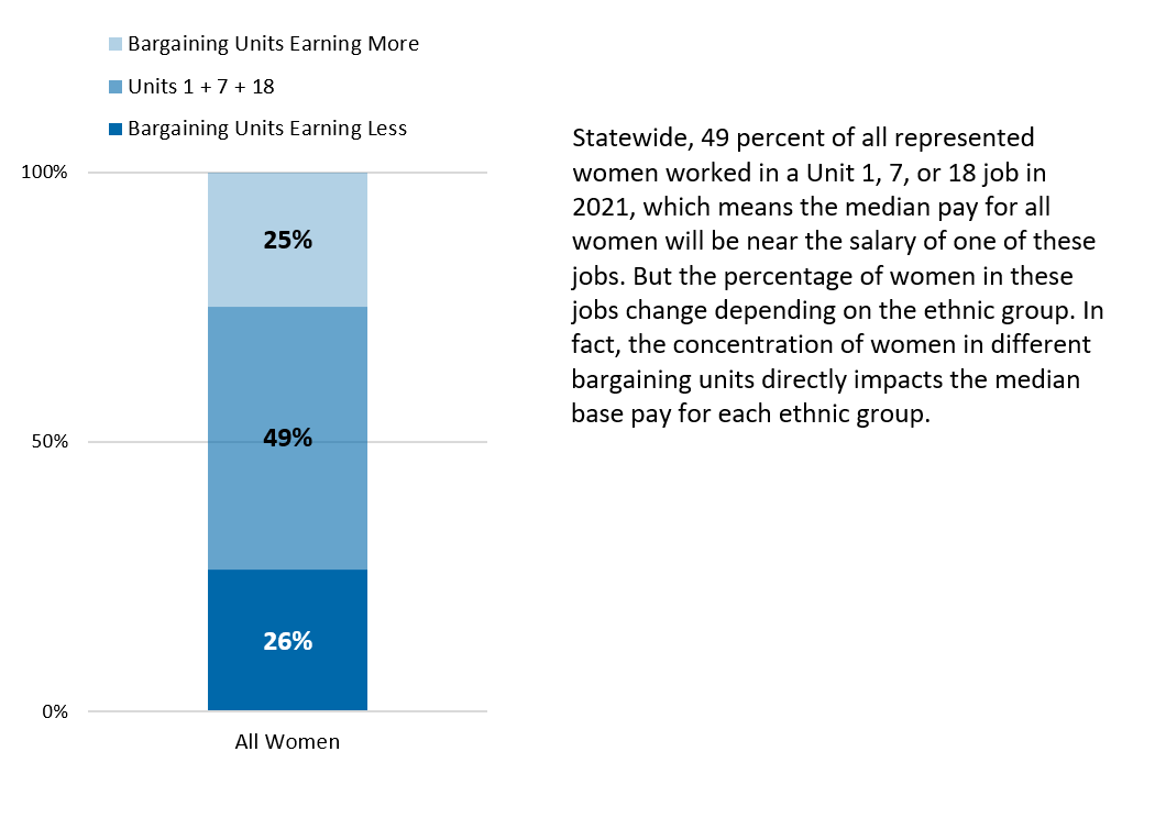 By comparing the percentage of women in different bargaining units, it becomes clear how this is impacting the median pay for women in different ethnic groups.