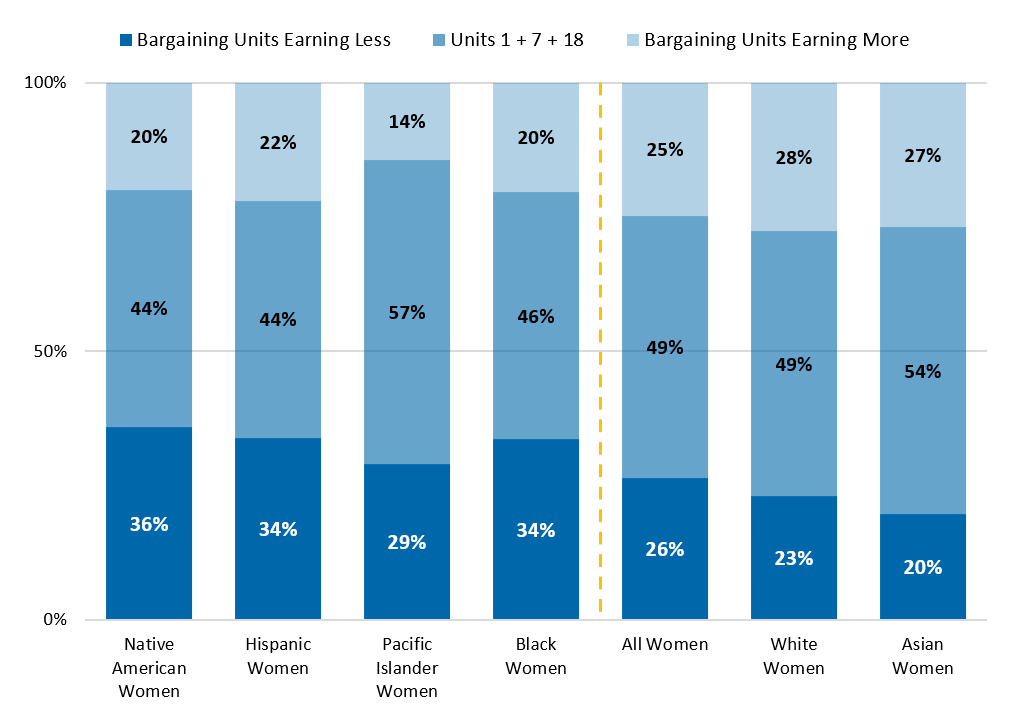 To the left of the yellow dotted line in the chart above, 29 to 36 percent of Native American, Hispanic, Pacific Islander, or Black women are employed in a job represented by a bargaining unit earning less than Unit 1, 7, or 18.