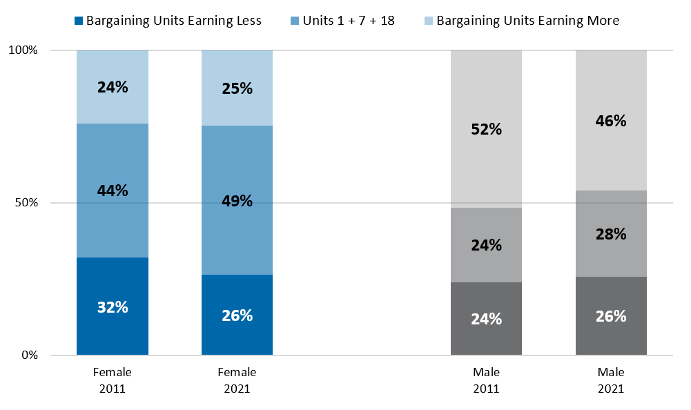 The chart below illustrates that in 2021, there was a female pay gap in 11 bargaining units, no pay gap in seven units, and a male pay gap (because the median pay for men was lower than median pay for women) in three units.[10]