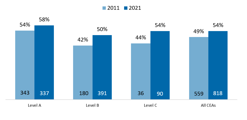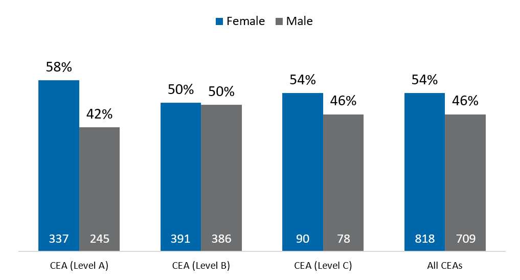 Women were 54 percent of all CEAs, and 58 percent at Level A, 50 percent at Level B, and 54 percent at Level C. However, because women comprised the largest percentage of CEAs at Level A, that effectively moved down the overall median base pay for all female CEAs relative to all male CEAs.