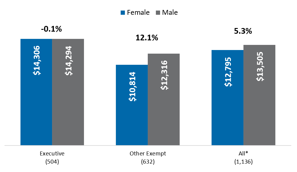 When focusing on just the Executive-Level Exempt positions, the median base pay was very comparable for females and males across these categories.