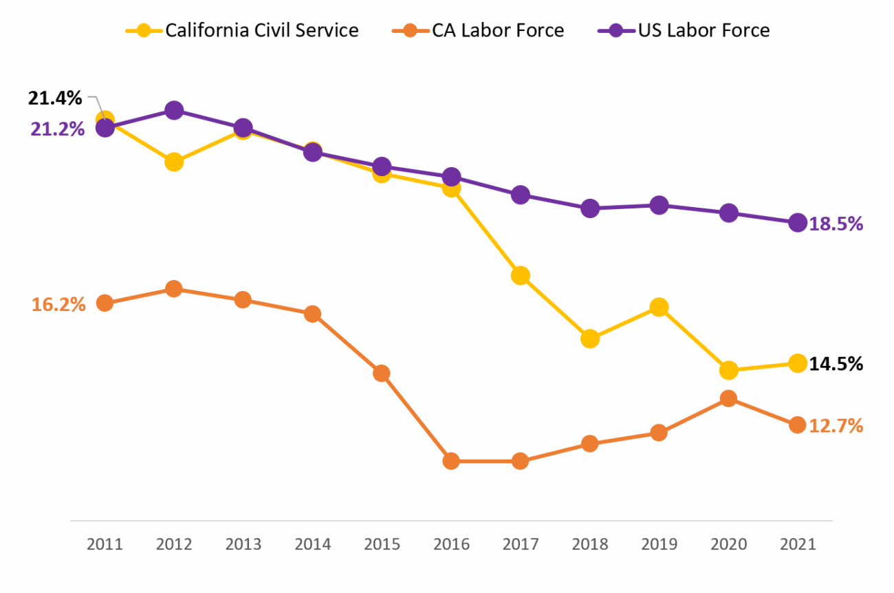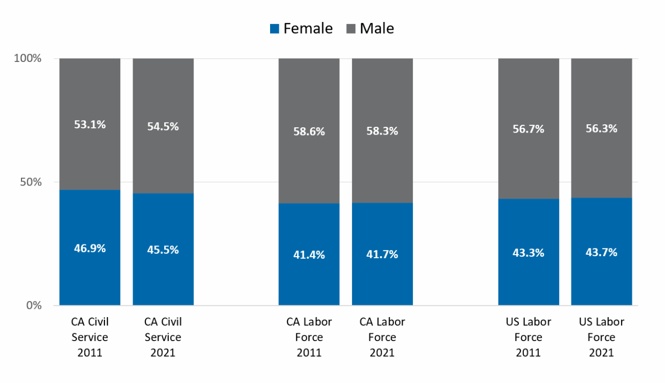 California’s state civil service employs a larger share of female workers than the California or U.S. labor market. However, between 2011 and 2021, the share of women employed in the state’s civil service has declined by 0.6 percent, while the share of women in the California and U.S. Labor Markets increased between 0.3 and 0.4 percent during the same period. [9]