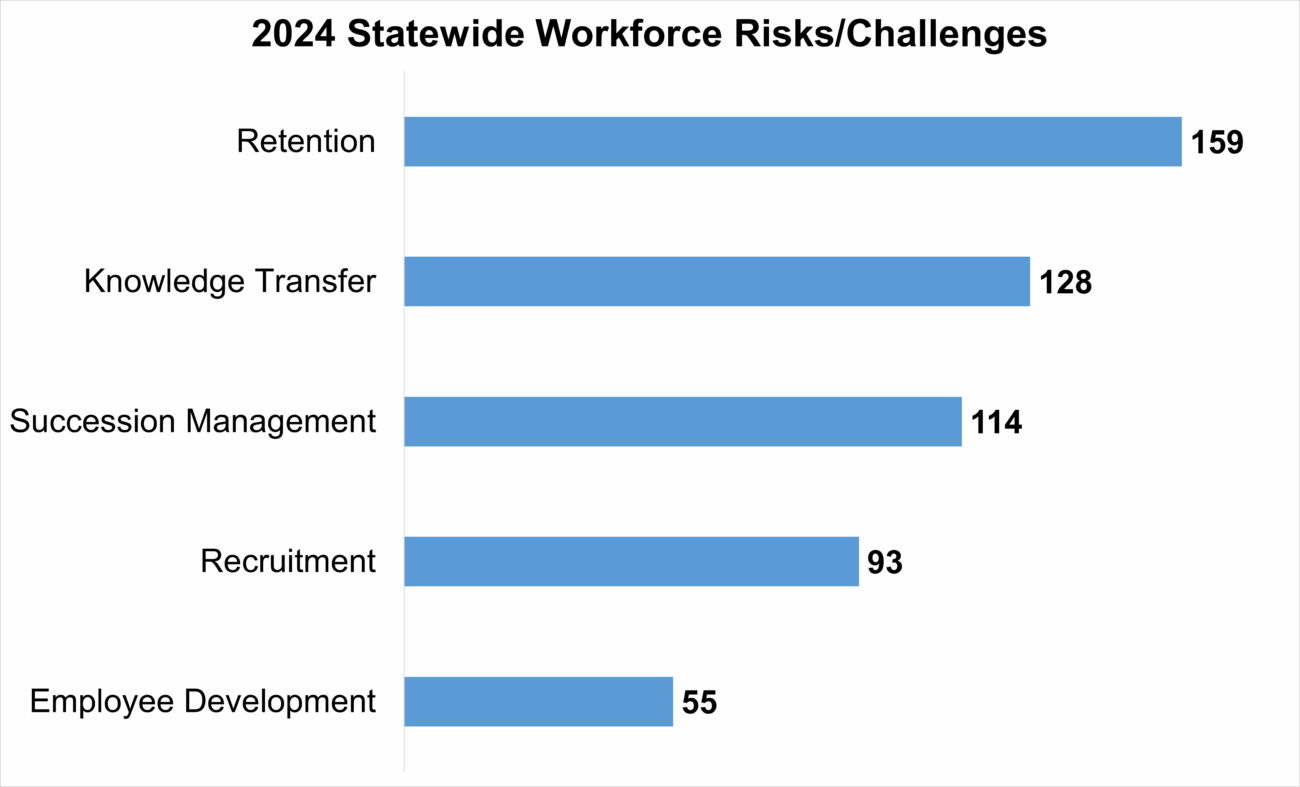 Survey respondents shared the workforce challenges and risks their organizations are facing, whether they have plans or not. Overall, retention and knowledge transfer were the biggest challenges, with retention being the top concern.